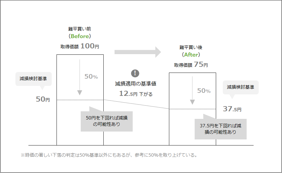 この点、難平買いによって平均取得単価が下がると、その計算構造上、減損の検討を行う基準値が下がることとなります。結果、時価下落局面においてその銘柄を追加取得すると、減損適用基準値が下がることとなり、減損回避に利用することが出来てしまいます。