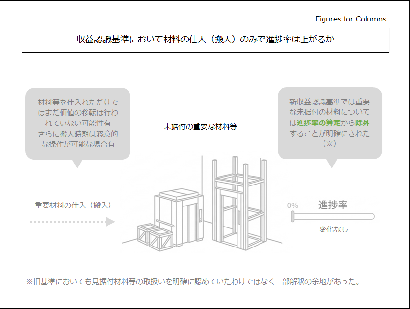 まず、従来実務では材料等の部材を現場に搬入し、備え付け前であっても進捗率に加味(収益計上)されるケースがありましたが、進捗度の算定から除外するという考え方が示されました。