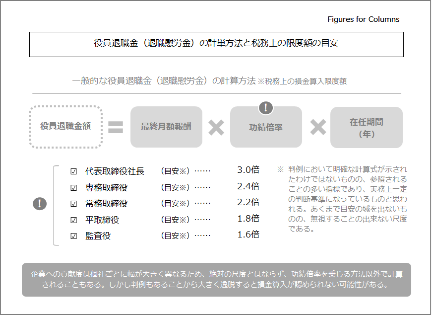 功績倍率の設定にあたっては、倍率の妥当性は企業ごとに異なり、個社の実情に即して設定する必要があります。上記の目安は絶対的ではないものの、無視することも出来ない基準であるといえます。
