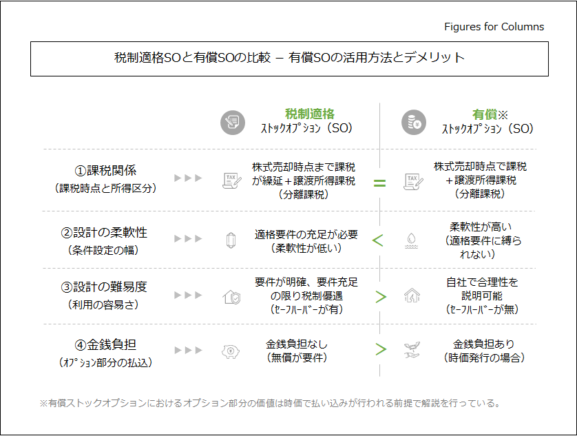 一方で、付与時の発行価額が適切な時価と認められ、行使価格の設定も妥当であれば、付与時および行使時の給与課税を生じさせず、売却時の譲渡所得課税に集約することが期待できます。税制適格ストックオプションほど対象者や要件が限定されないため、多様なエグジットを想定した設計や、税制適格ストックオプションでは付与できない者に対して発行が可能といったメリットがありますが、評価と説明の難しさというデメリットが常に存在します。