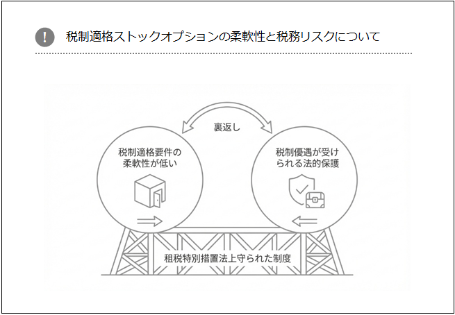 これらの明確に定められたルールを守ることにより、原則として行使時に給与課税が行われず、株式売却時に譲渡所得として課税される取扱いが認められます。要件を満たしている限り、税務上の扱いについて一種のセーフハーバーが用意されていることが税制適格ストックオプションの大きな特徴です。