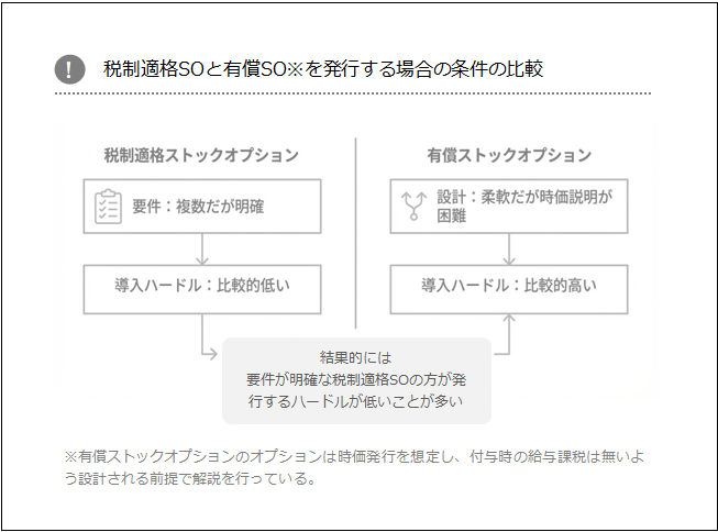 個人的な見解としては、発行対象者や権利行使期間などを踏まえて、発行したいストックオプションが税制適格の枠に収まるのであれば、まずは税制適格ストックオプションの採用を検討することをお勧めします。一方で、その枠に収まらない条件や対象者を想定している場合には、有償ストックオプションによる設計を検討するのが良いでしょう。ただし、有償ストックオプションの税務上の設計は複雑であり、発行価額や条件設定を誤った場合のリスクも大きいため、評価やスキーム設計の段階から専門家が関与することを強くお勧めします。