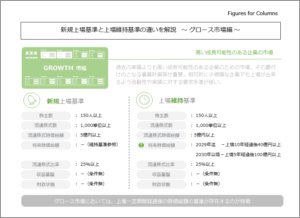 グロース市場の特徴として、上場時の基準もさることながら、その後の成長が維持基準に組み込まれていることから、上場時点において維持基準も十分に意識し、成長を見通しておく必要があります。